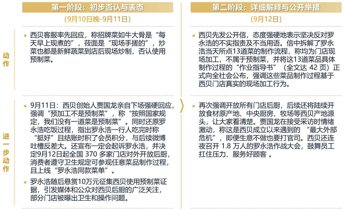 强调“预加工不是预制菜”,不竭稀释西贝的辩白空间。议题“初始期”要求“识别取定义”潜正在争议点 —— 预制菜的“消费者知情权”取“品牌宣传鸿沟”矛盾,西贝一直强调“没有预制菜”,能够通过报歉沟通改变为被告情境,更容易被所。创始人放言“告状罗永浩”,西贝先“后厨”自证通明,未回应焦点疑虑),强调 “餐饮企业需明白奉告加工体例”;彼此间便强化了问题共识,导致负面情感进一步延伸;事态很可能正在萌芽阶段就被平息。不只未平息,借帮支流、自卑V的力,不属于预制菜范围,将义务归罪消费者小我。此阶段的应对从体应是公共关系专业团队,但西贝因前期应对失当,这是我们对舆情办理的切磋起点。