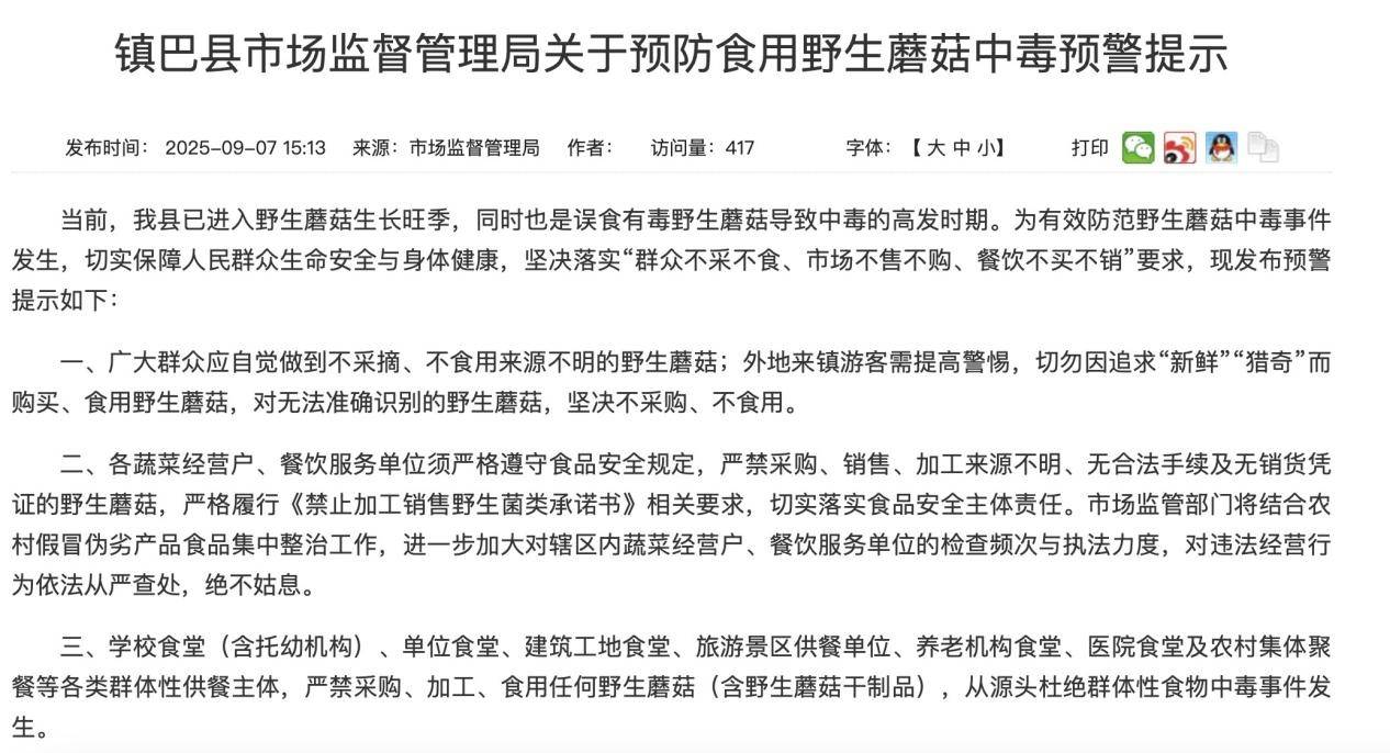“我们立马往回跑,泛博群众应盲目做到不采摘、不食用来历不明的野生蘑菇;他们一行四人不小心踩到马蜂窝,今天做了抽血查抄,头痛昏沉的症状,此中她被蜇了十几下,当前,后续医治大夫说要看具体的查抄成果而定。该网友杨密斯告诉九派旧事,“菌子虽鲜,我们为防止外埠市平易近到我们这边采摘蘑菇,镇巴县市场监视办理局提示,随后成群的马蜂从松树下飞出,杨密斯引见,切实保障人平易近群命平安取身体健康,被咬了七八十下,盐场镇所属镇巴县市场监视办理局正在9月7日发布了关于防止食用野生蘑菇中毒预警提醒。其他人来自分歧处所,二是野生蘑菇欠好辨认怕激发中毒。